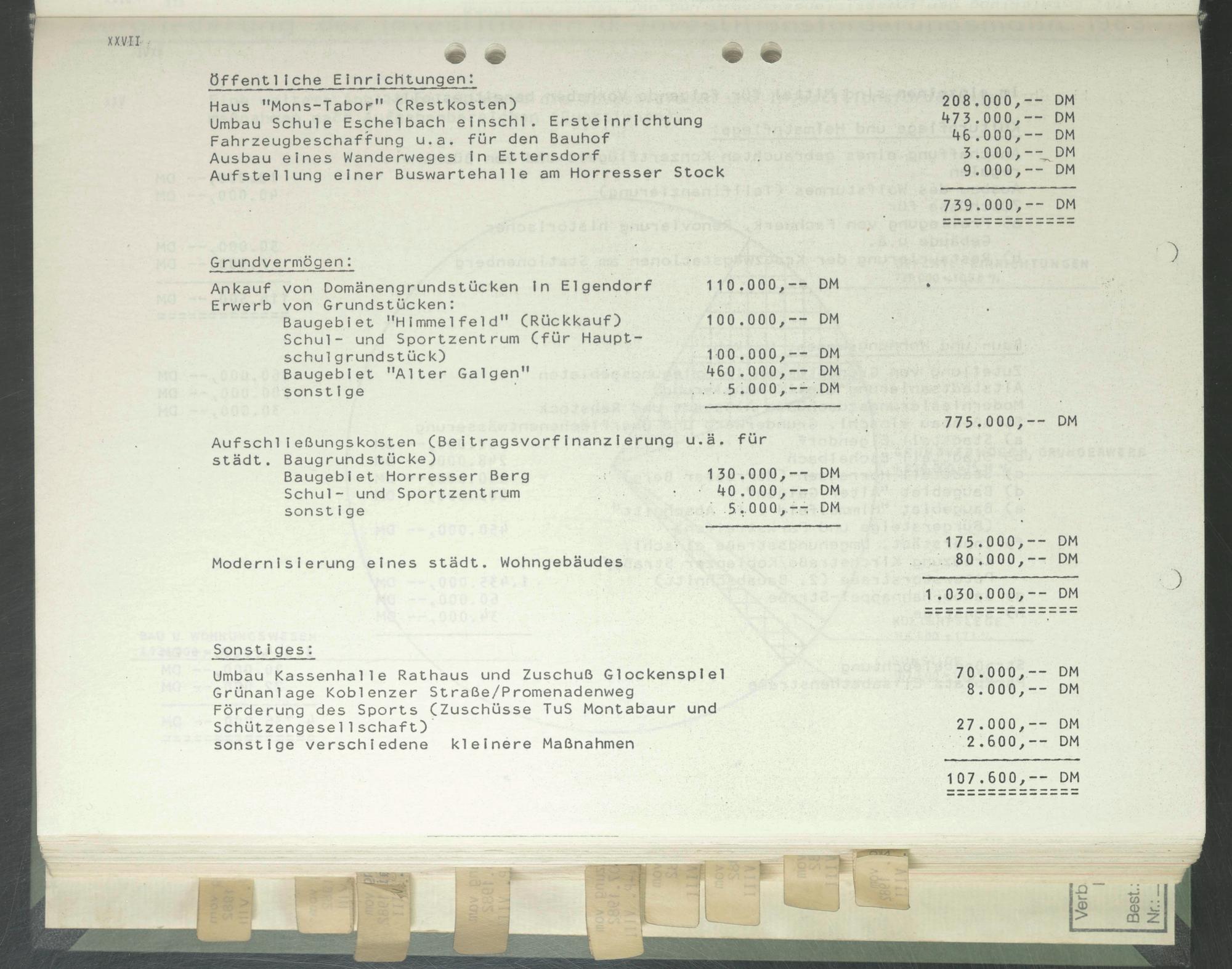 Umbau Kassenhalle Rathaus und Zuschuß Glockenspiel Grünanlage Koblenzer Straße/Promenadenweg Förderung des Sports (Zuschüsse TuS Montabaur und Schützengesel 1schaft)