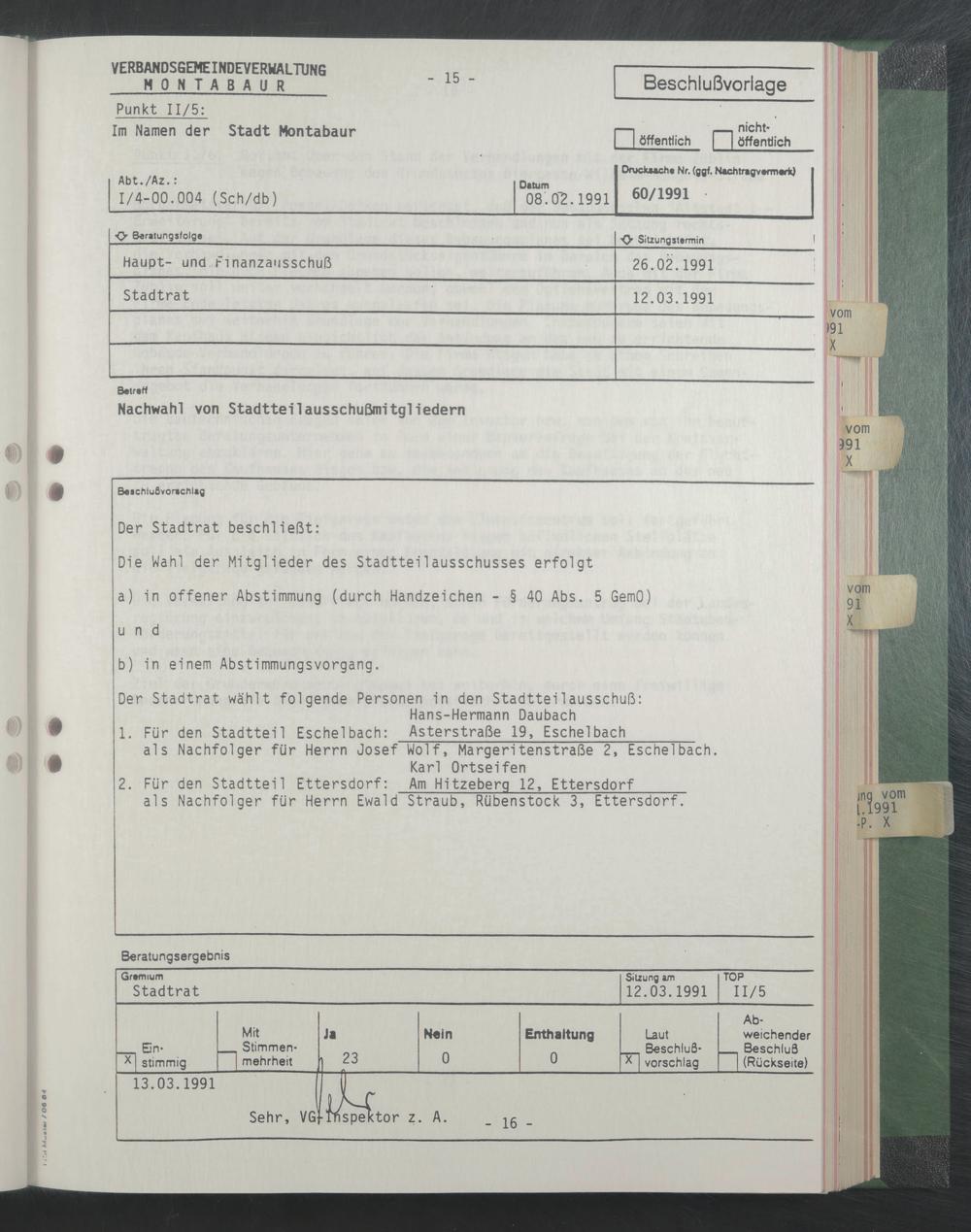Der Stadtrat wählt folgende Personen ln den Stadttellausschuß: