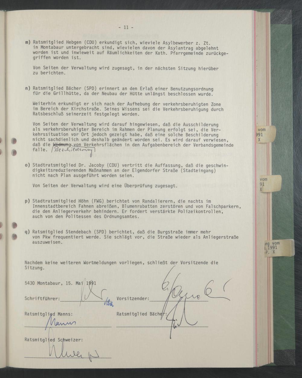 p) Stadtratsmitglied Höhn (FWG) berichtet von Randalierern, die nachts im Innenstadtbereich Fahnen abreißen, Blumenrabatten zerstören und von Falschparkern, die den Anliegerverkehr behindern. Er fordert verstärkte Polizeikontrollen,