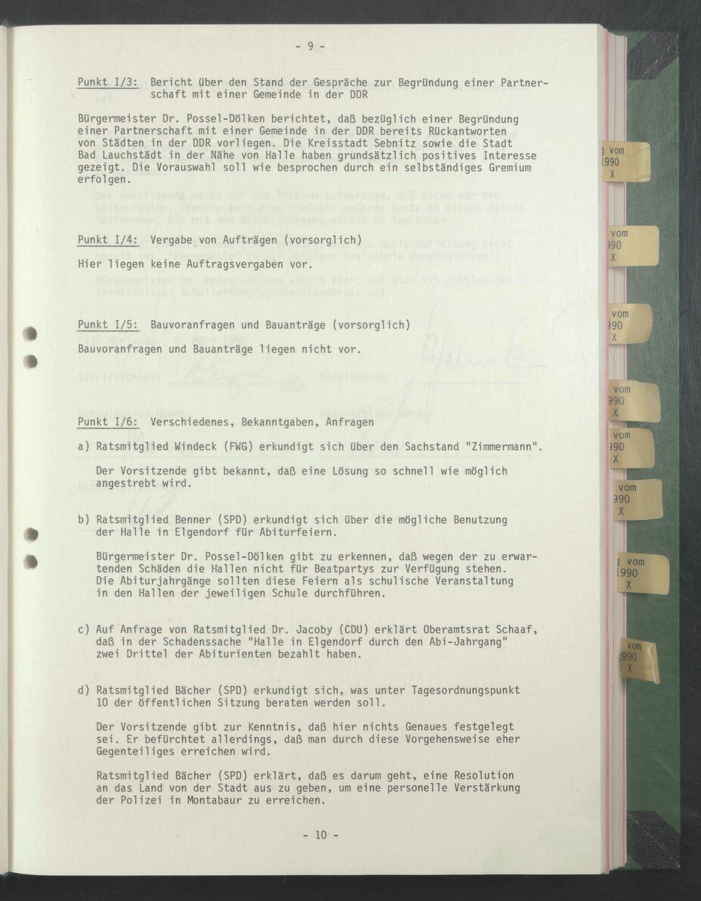 Bürgermeister Dr. Posse!-Dölken berichtet, daß bezüglich einer Begründung einer Partnerschaft mit einer Gemeinde in der DDR bereits Rückantworten von Städten in der DDR vorliegen. Die Kreisstadt Sebnitz sowie die Stadt Bad Lauchstädt in der Nähe von Halle haben grundsätzlich positives Interesse gezeigt. Die Vorauswahl soll wie besprochen durch ein selbständiges Gremium erfolgen.