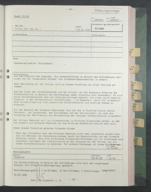 I Die FMG-Fraktion hat angeregt, die Verkehrsführung im Bereich des Schloßberges nach j ! einem von ihr vorgelegten Konzept (mit Einbahnstraßenregelung) zu ändern. ;