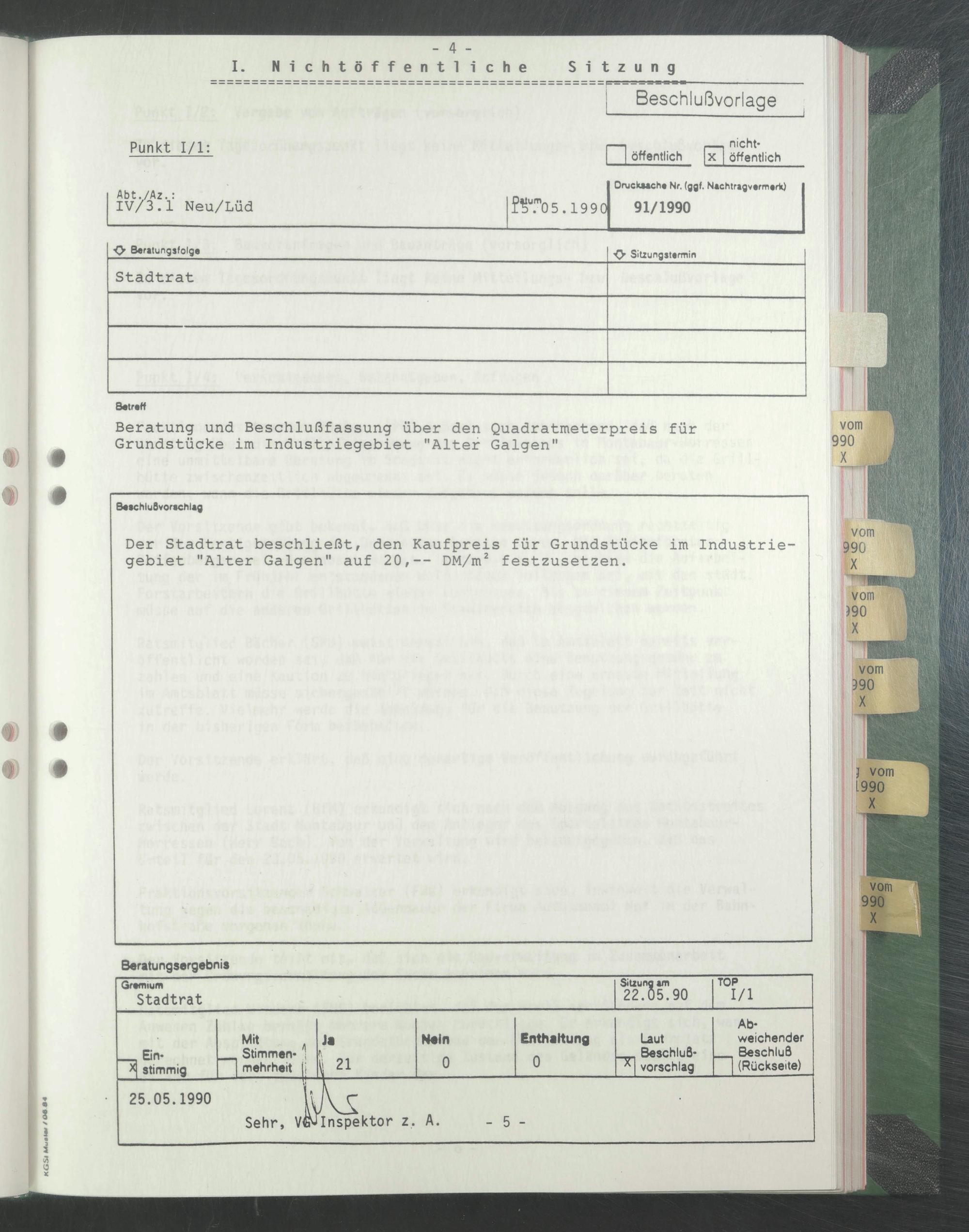 Der Stadtrat beschließt, den Kaufpreis für Grundstücke im Industriegebiet "Alter Galgen" auf 20,— DM/m^ festzusetzen.