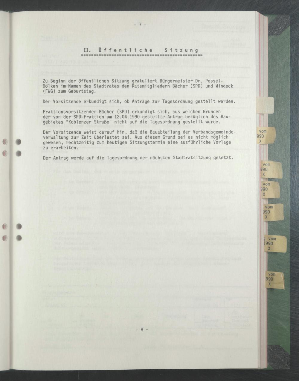 Fraktionsvorsitzender Bacher (SPD) erkundigt sich, aus welchen Gründen der von der SPD-Fraktion am 12.04.1990 gestellte Antrag bezüglich des Baugebietes "Koblenzer Straße" nicht auf die Tagesordnung gestellt wurde.