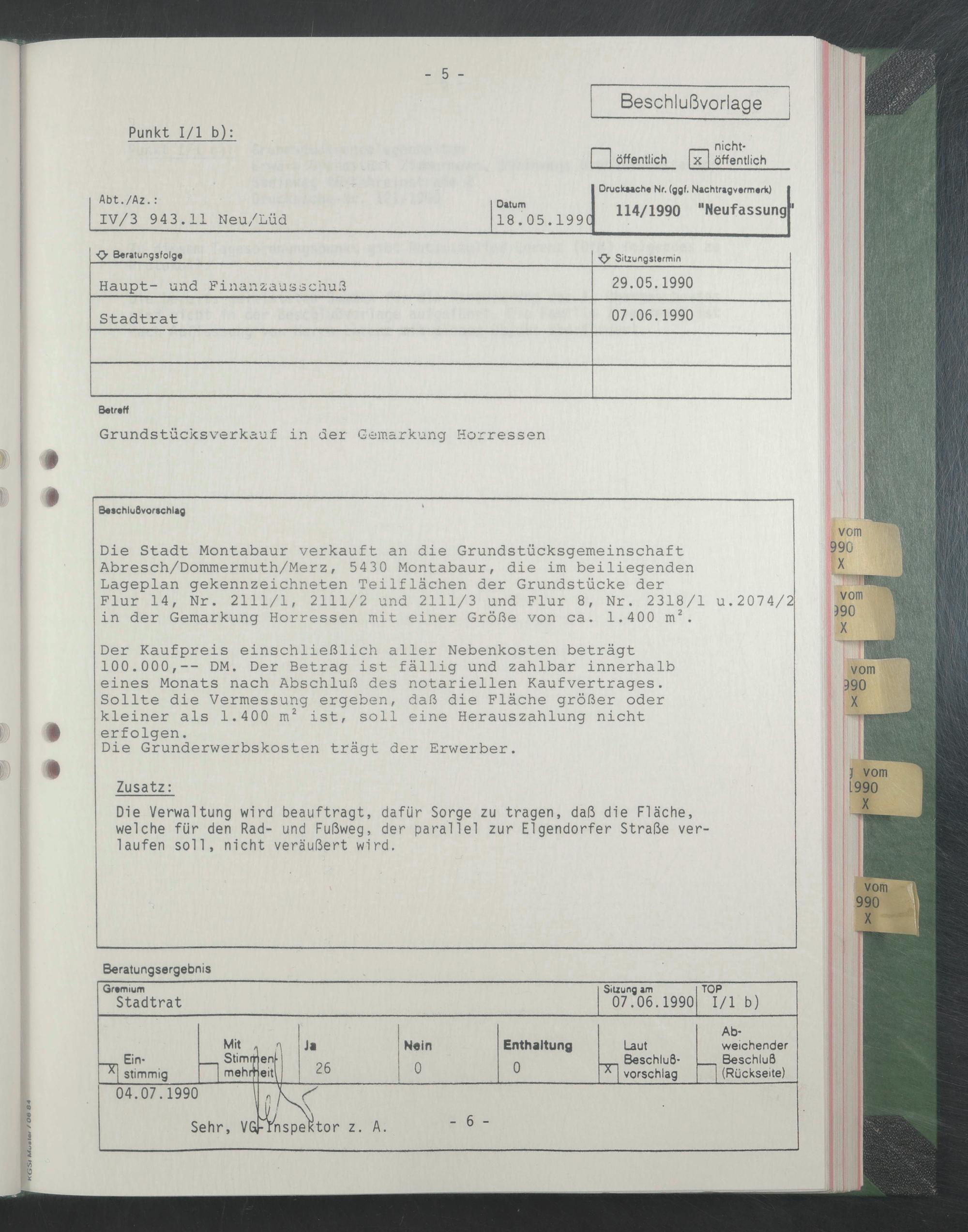Die Stadt Montabaur verkauft an die Grundstücksgemeinschaft Abresch/Dommermuth/Merz, 5430 Montabaur, die im beiliegenden Lageplan gekennzeichneten Teilflächen der Grundstücke der Flur 14, Nr. 2111/1, 2111/2 und 2111/3 und Flur 8, Nr. 2318/1 u.2074/2 in der Gemarkung Horressen mit einer Größe von ca. 1.400 m^.
