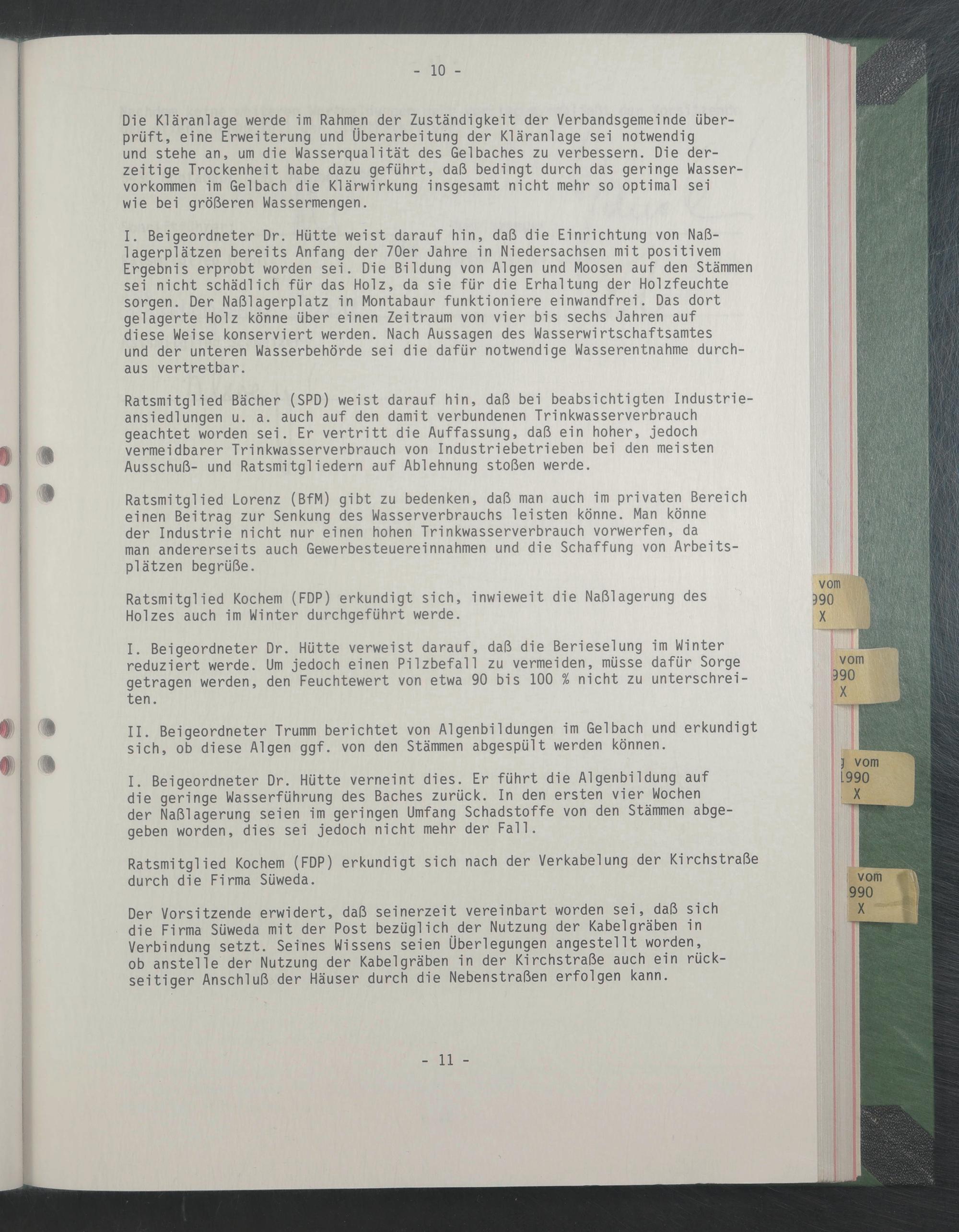 I. Beigeordneter Dr. Hütte verneint dies. Er führt die Algenbildung auf die geringe Wasserführung des Baches zurück. In den ersten vier Wochen der Naßlagerung seien im geringen Umfang Schadstoffe von den Stämmen abgegeben worden, dies sei jedoch nicht mehr der Fall.
