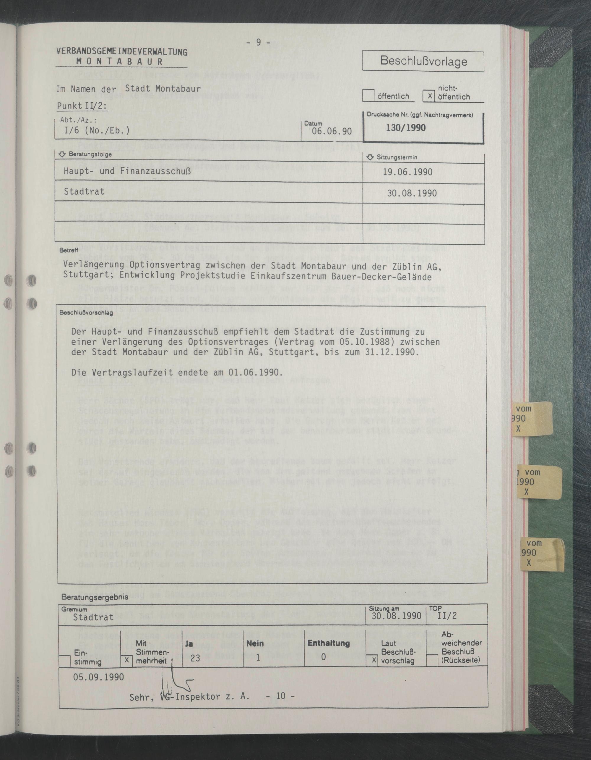 Der Haupt- und Finanzausschuß empfiehlt dem Stadtrat die Zustimmung zu einer Verlängerung des Optionsvertrages (Vertrag vom 05.10.1988) zwischen der Stadt Montabaur und der Züblin AG, Stuttgart, bis zum 31.12.1990.