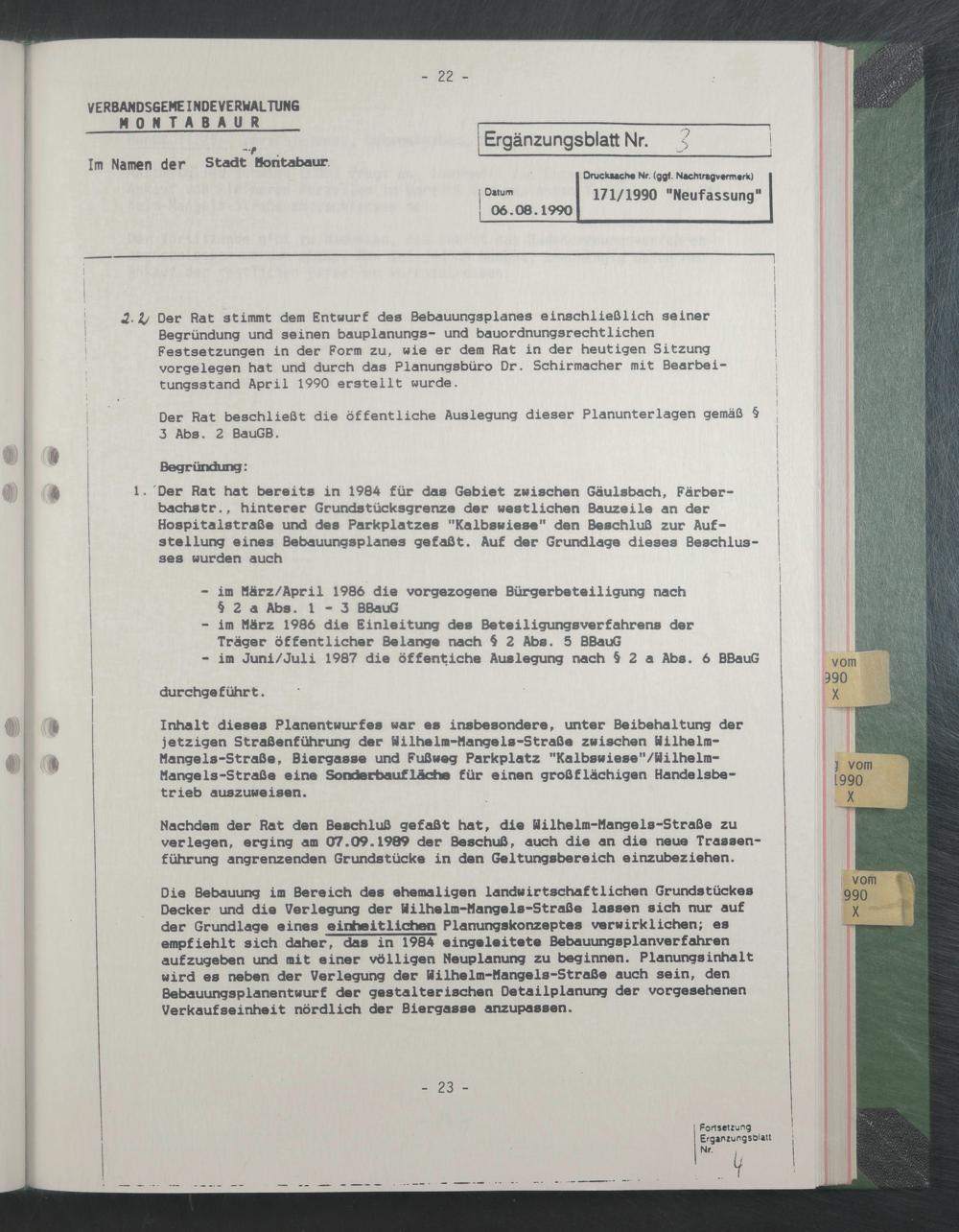 Der Rat stimmt dem Entwurf des Bebauungsplanes einschließlich seiner Begründung und seinen bauplanungs- und bauordnungsrechtlichen Festsetzungen in der Form zu, wie er dem Rat in der heutigen Sitzung Vorgelegen hat und durch das Planungsbüro Dr. Schirmacher mit Bearbeitungsstand April 1990 erstellt wurde.