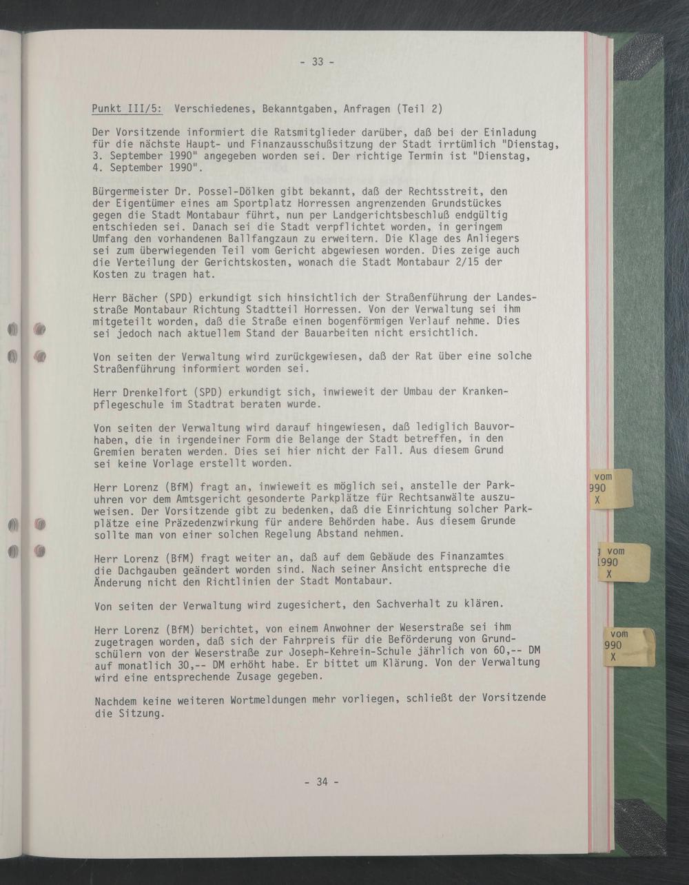 Bürgermeister Dr. Possel-Dölken gibt bekannt, daß der Rechtsstreit, den der Eigentümer eines am Sportplatz Horressen angrenzenden Grundstückes gegen die Stadt Montabaur führt, nun per Landgerichtsbeschluß endgültig entschieden sei. Danach sei die Stadt verpflichtet worden, in geringem Umfang den vorhandenen Bai Ifangzaun zu erweitern. Die Klage des Anliegers sei zum überwiegenden Teil vom Gericht abgewiesen worden. Dies zeige auch die Verteilung der Gerichtskosten, wonach die Stadt Montabaur 2/15 der Kosten zu tragen hat.