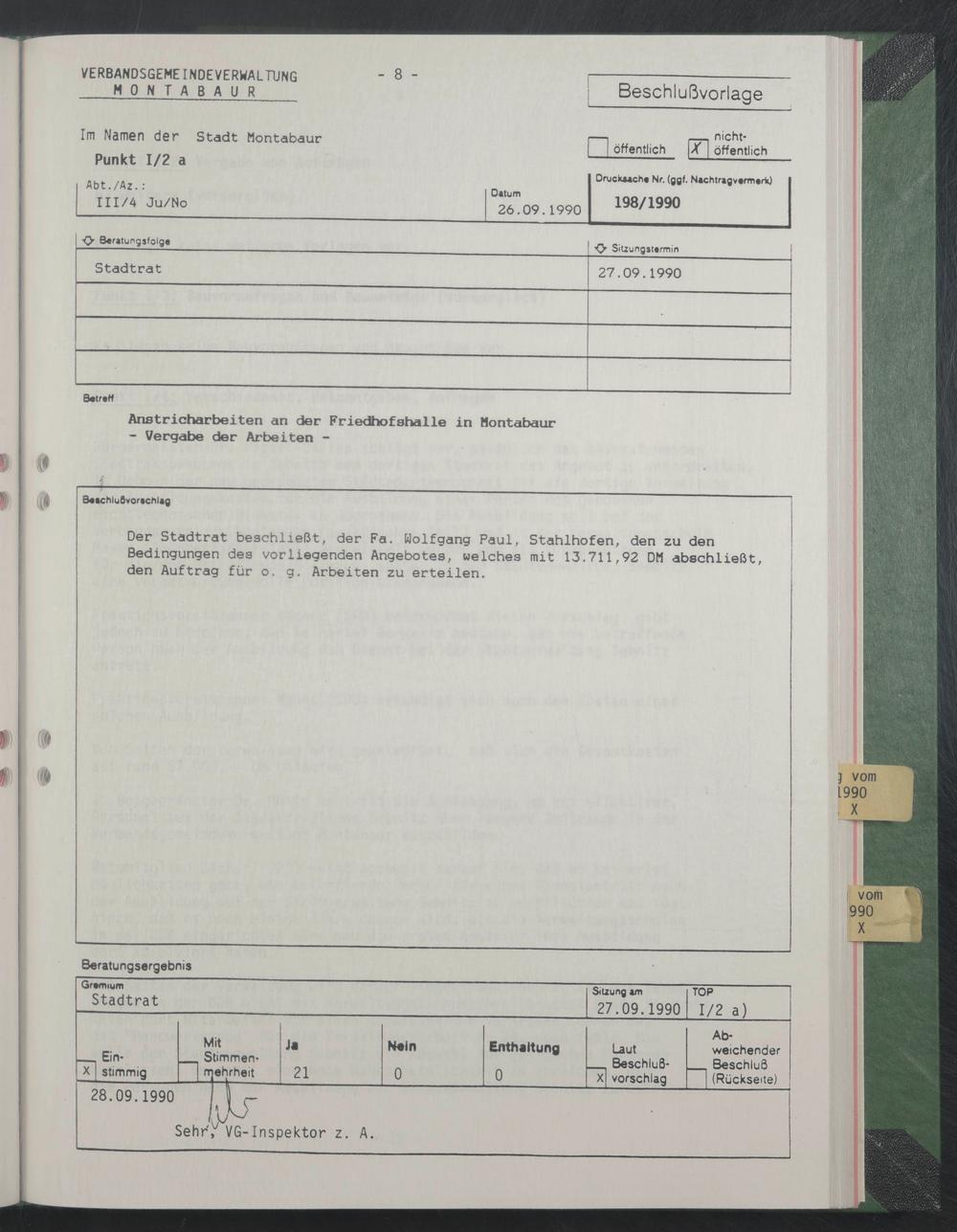 Der Stadtrat beschließt, der Fa. Holfgang Paul, Stahlhofen, den zu den Bedingungen des vorliegenden Angebotes, welches mit 13.711,92 DM abschließt, den Auftrag für o. g. Arbeiten zu erteilen.