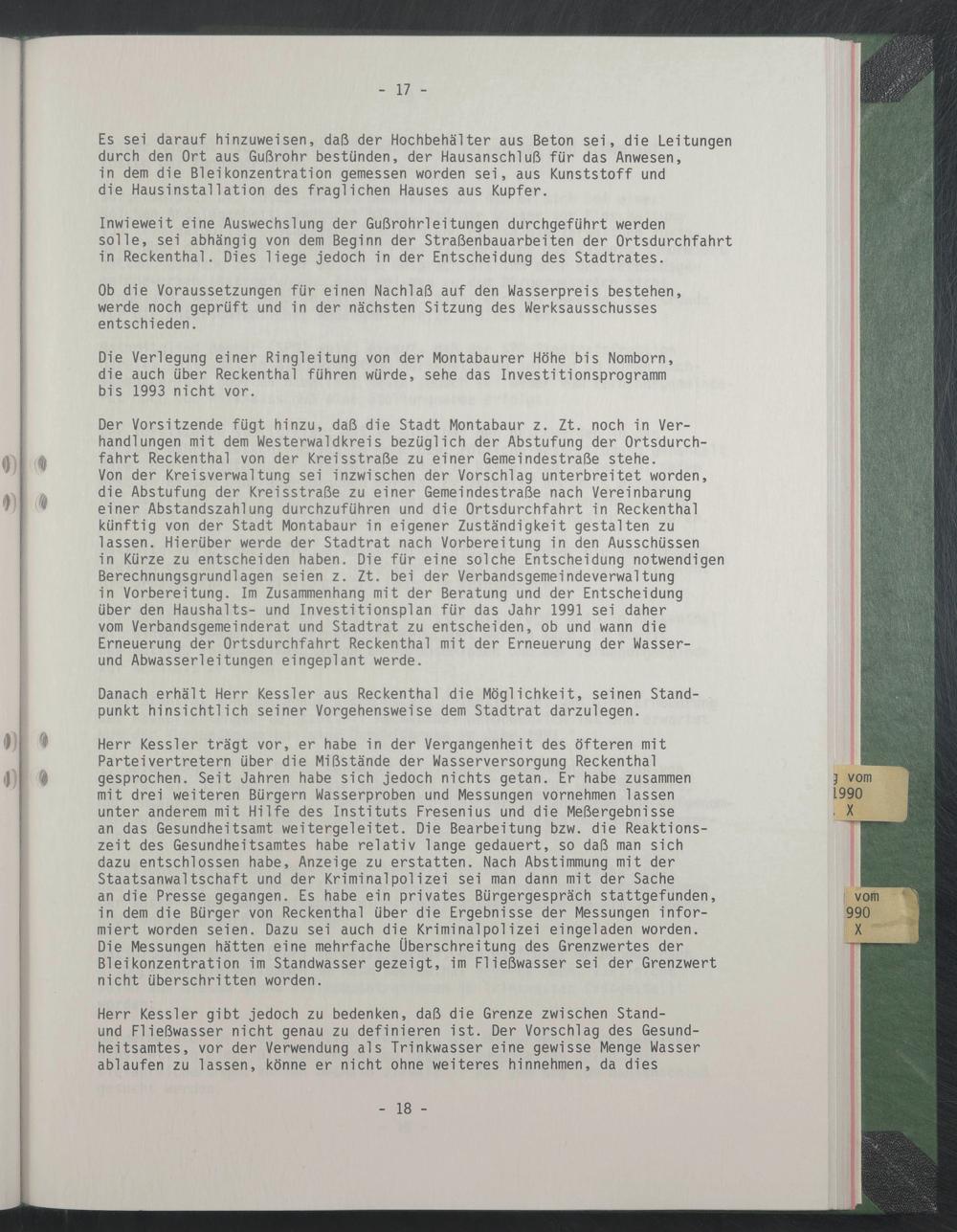 Von der Kreisverwaltung sei inzwischen der Vorschlag unterbreitet worden, die Abstufung der Kreisstraße zu einer Gemeindestraße nach Vereinbarung einer Abstandszahlung durchzuführen und die Ortsdurchfahrt in Reckenthal künftig von der Stadt Montabaur in eigener Zuständigkeit gestalten zu lassen. Hierüber werde der Stadtrat nach Vorbereitung in den Ausschüssen in Kürze zu entscheiden haben. Die für eine solche Entscheidung notwendigen Berechnungsgrundlagen seien z. Zt. bei der Verbandsgemeindeverwaltung in Vorbereitung. Im Zusammenhang mit der Beratung und der Entscheidung über den Haushalts- und Investitionsplan für das Jahr 1991 sei daher vom Verbandsgemeinderat und Stadtrat zu entscheiden, ob und wann die Erneuerung der Ortsdurchfahrt Reckenthal mit der Erneuerung der Wasser- und Abwasserleitungen eingeplant werde.