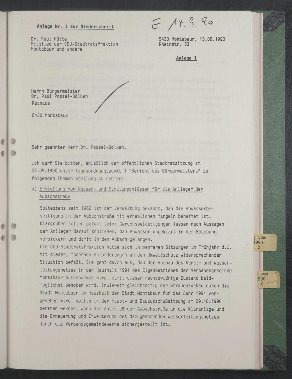 Die CDU-Stadtratsfraktion hatte sich in mehreren Sitzungen im Frühjahr d.J. mit dieser, modernen Anforderungen an den Umweltschutz widersprechenden Situation befaßt. Sie geht davon aus, daß der Ausbau des Kanal- und Wasserleitungsnetzes in den Haushalt 1991 des Eigenbetriebes der Verbandsgemeinde Montabaur aufgenommen wird, damit dieser rechtswidrige Zustand baldmöglichst behoben wird. Inwieweit gleichzeitig der Straßenausbau durch die Stadt Montabaur im Haushalt der Stadt Montabaur für das Jahr 1991 vorgesehen wird, sollte in der Haupt- und Bauausschußsitzung am 09.10.1990 beraten werden, wenn der Anschluß der Aubachstraße an die Kläranlage und die Erneuerung und Erweiterung des dazugehörenden Wasserleitungsnetzes durch die Verbandsgemeindewerke sichergestellt ist.