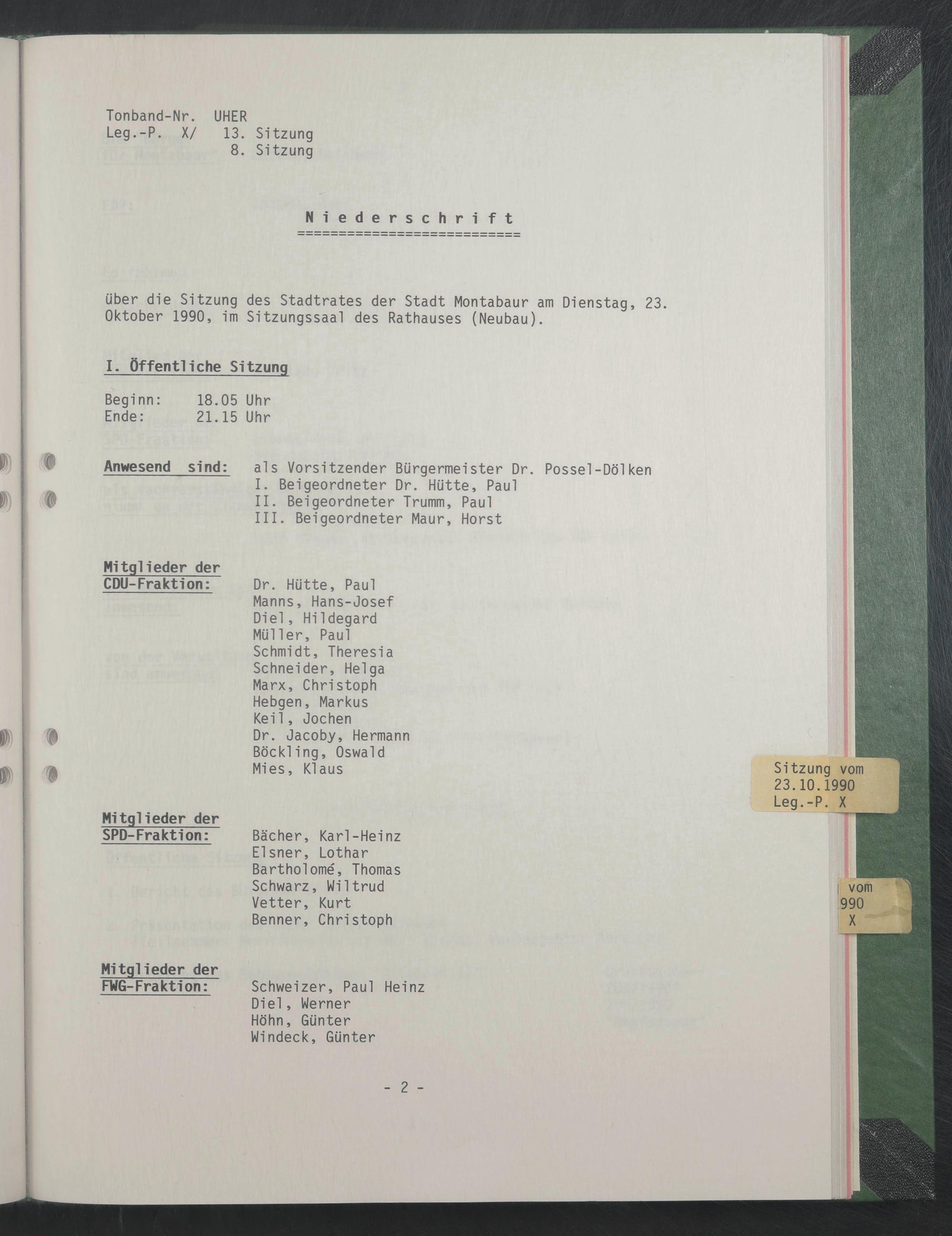 über die Sitzung des Stadtrates der Stadt Montabaur am Dienstag, 23. Oktober 1990, im Sitzungssaal des Rathauses (Neubau).