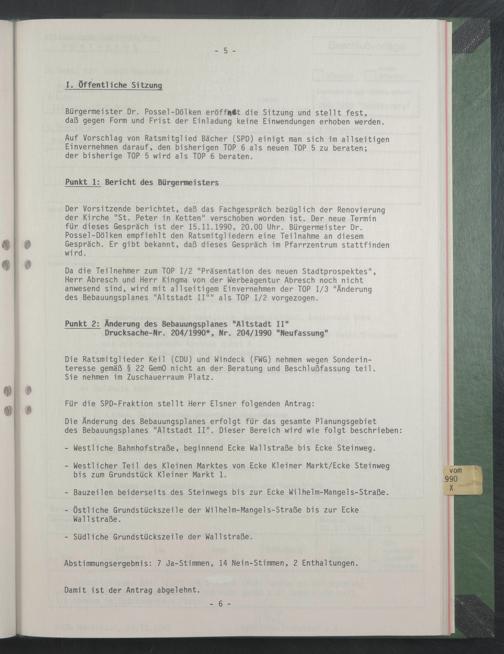 Da die Teilnehmer zum TOP 1/2 "Präsentation des neuen Stadtprospektes", Herr Abresch und Herr Kingma von der Werbeagentur Abresch noch nicht anwesend sind, wird mit all sei tigern Einvernehmen der TOP 1/3 "Änderung des Bebauungsplanes "Altstadt II"" als TOP 1/2 vorgezogen.