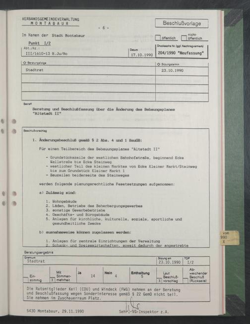 Die Ratsmitglieder Keil (CDU) und Windeck (FWG) nehmen an der Beratung und Beschlußfassung wegen Sonderinteresse gemäß § 22 GemO nicht teil.