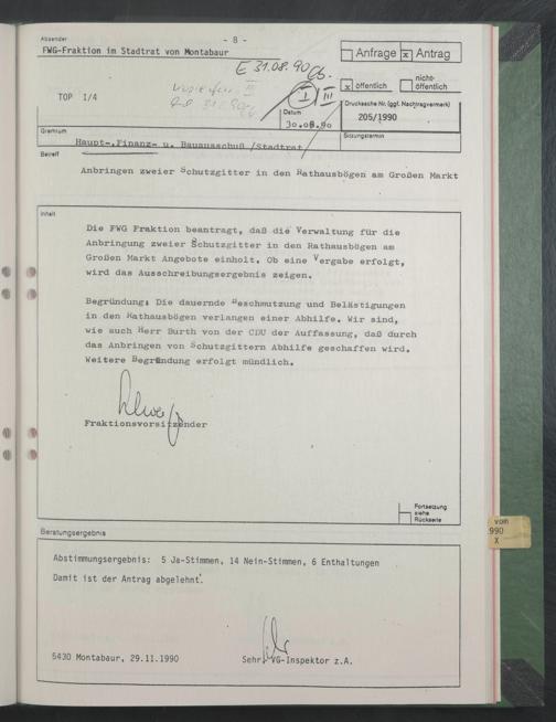 Die FWG Fraktion beantragt, daß die Verwaltung für die Anbringung zweier Schutzgitter in den Rathausbögen am Großen Markt Angebote einholt. Ob eine ^ergäbe erfolgt, wird das Ausschreibungsergebnis zeigen.