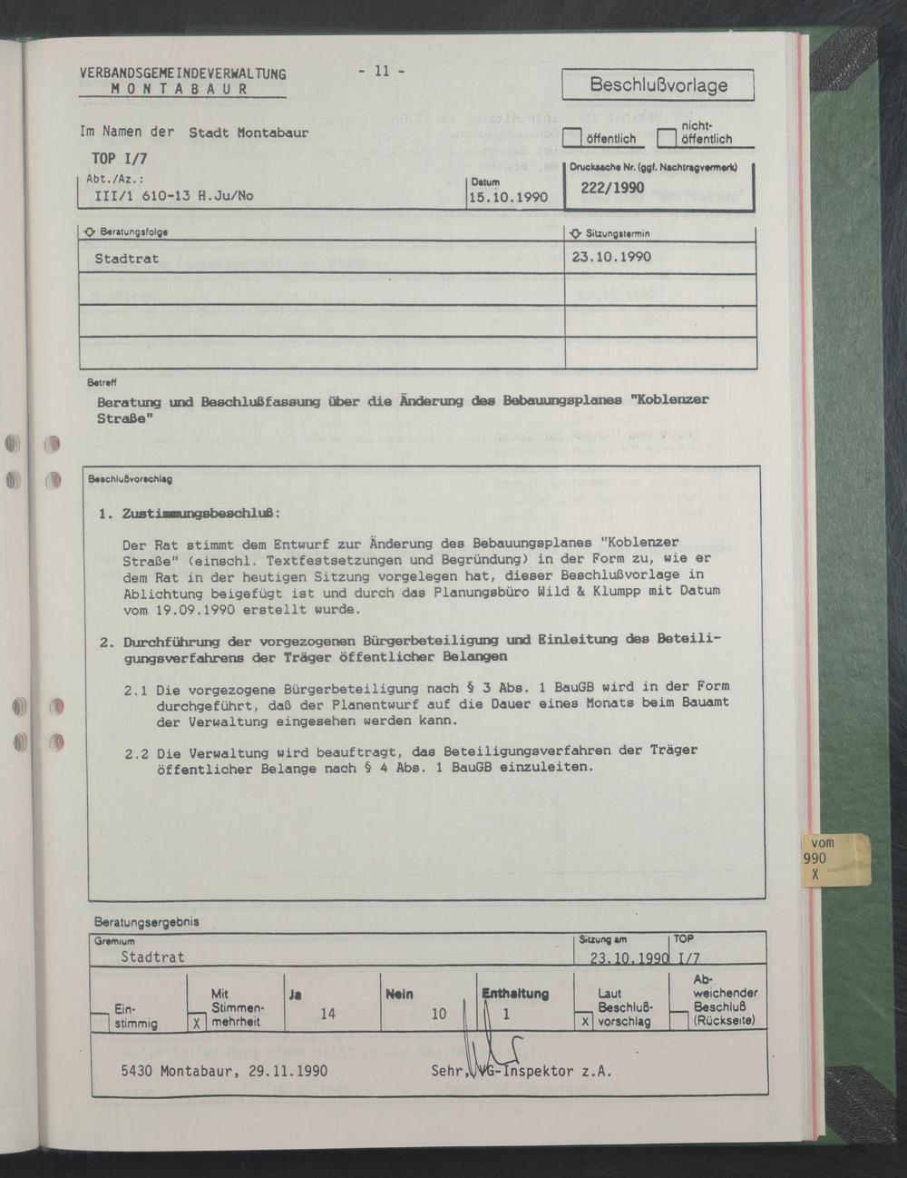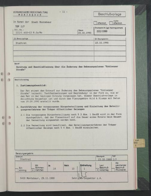 Der Rat stimmt dem Entwurf zur Änderung des Bebauungsplanes "Koblenzer Straße" (einschl. Textfestsetzungen und Begründung) in der Form zu, wie er dem Rat in der heutigen Sitzung Vorgelegen hat, dieser Beschlußvorlage in Ablichtung beigefügt ist und durch das Planungsbüro Wild & Klumpp mit Datum vom 19.09.1990 erstellt wurde.