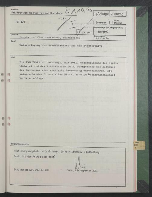 Die FVG Fraktion beantragt, zur evtl^Unterbringung der Stadtbücherei und des Stadtarchivs im 2. Obergeschoß des Altbaues des Rathauses eine statische Berechnung durchzuführen. Die entsprechenden finanziellen Mittel sind im ^achtragshaushalt zu veranschlagen.