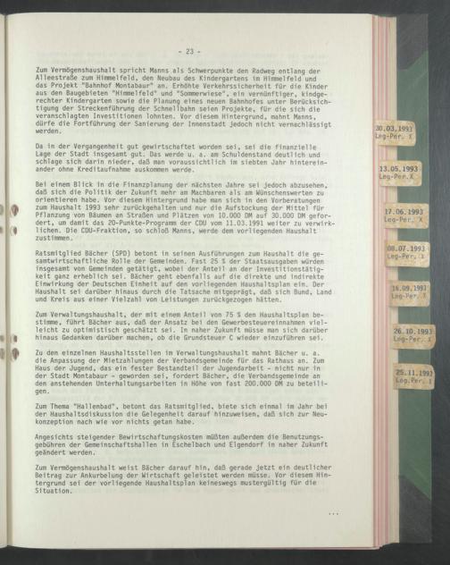 Bei einem Blick in die Finanzplanung der nächsten Jahre sei jedoch abzusehen, daß sich die Politik der Zukunft mehr am Machbaren als am Wünschenswerten zu orientieren habe. Vor diesem Hintergrund habe man sich in den Vorberatungen zum Haushalt 1993 sehr zurückgehalten und nur die Aufstockung der Mittel für Pflanzung von Bäumen an Straßen und Plätzen von 10.000 DM auf 30.000 DM gefordert, um damit das 20-Punkte-Programm der CDU vom 11.03.1991 weiter zu verwirklichen. Die CDU-Fraktion, so schloß Manns, werde dem vorliegenden Haushalt zustimmen.