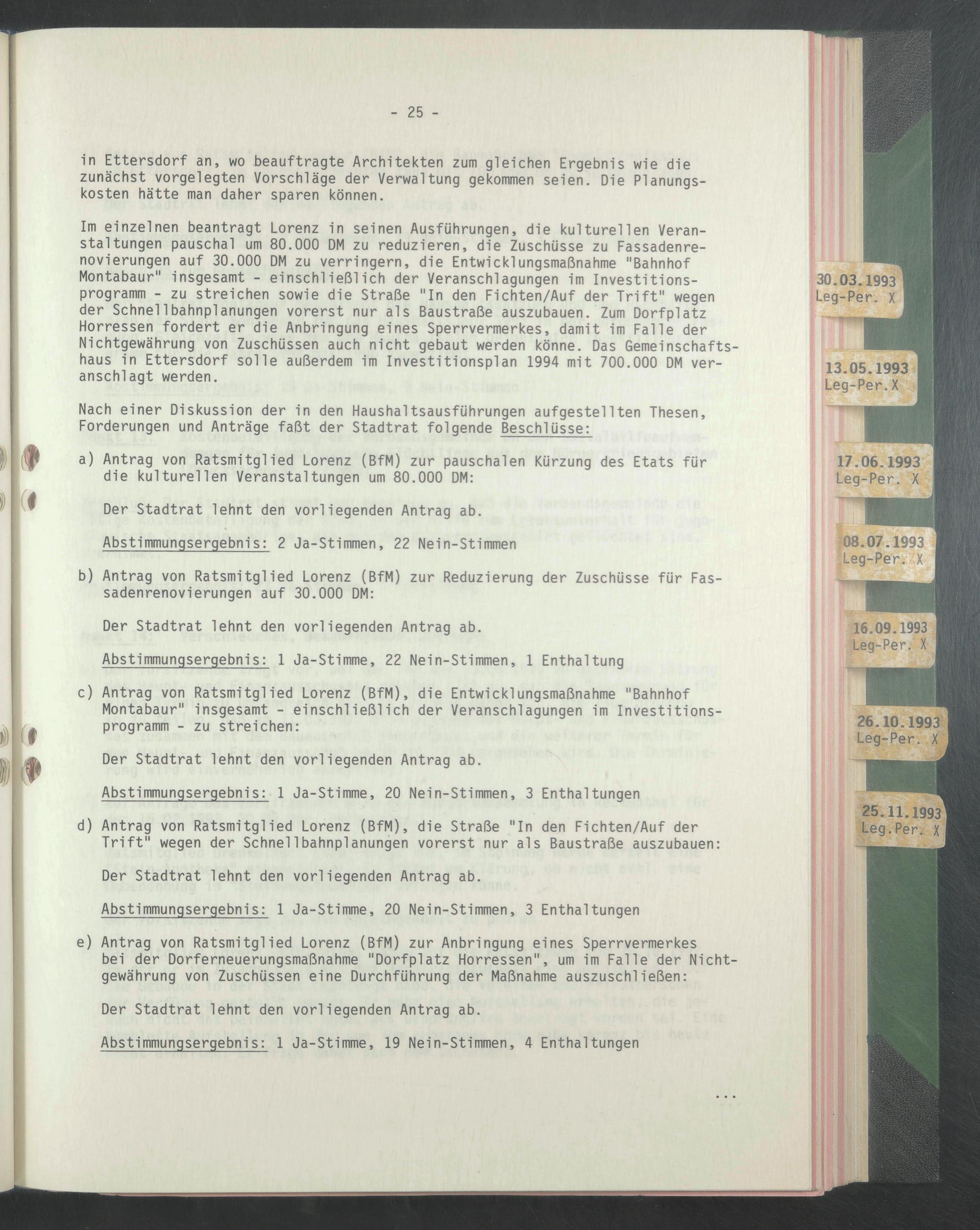 Im einzelnen beantragt Lorenz in seinen Ausführungen, die kulturellen Veranstaltungen pauschal um 80.000 DM zu reduzieren, die Zuschüsse zu Fassadenrenovierungen auf 30.000 DM zu verringern, die Entwicklungsmaßnahme "Bahnhof Montabaur" insgesamt - einschließlich der Veranschlagungen im Investitionsprogramm - zu streichen sowie die Straße "In den Fichten/Auf der Trift" wegen der Schnellbahnplanungen vorerst nur als Baustraße auszubauen. Zum Dorfplatz Horressen fordert er die Anbringung eines Sperrvermerkes, damit im Falle der Nichtgewährung von Zuschüssen auch nicht gebaut werden könne. Das Gemeinschaftshaus in Ettersdorf solle außerdem im Investitionsplan 1994 mit 700.000 DM veranschlagt werden.