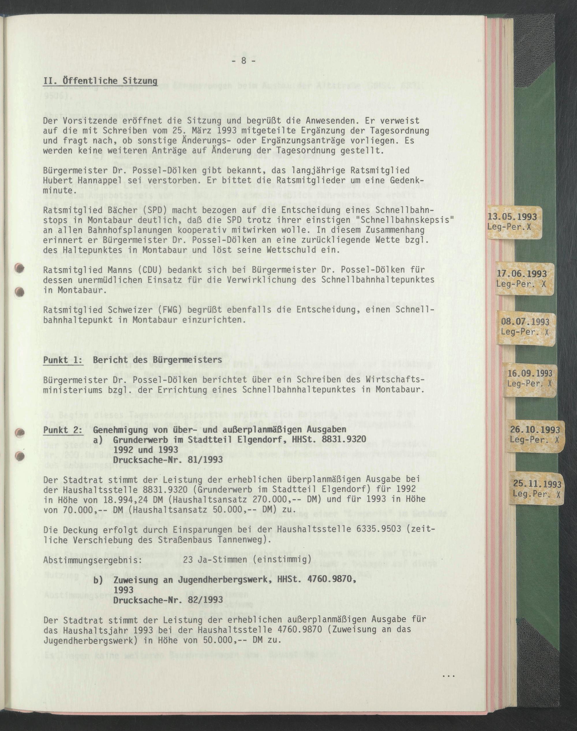 Der Stadtrat stimmt der Leistung der erheblichen außerplanmäßigen Ausgabe für das Haushaltsjahr 1993 bei der Haushaltsstelle 4760.9870 (Zuweisung an das Jugendherbergswerk) in Höhe von 50.000,— DM zu.