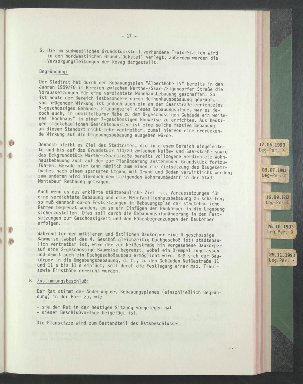 Dennoch bleibt es Ziel des Stadtrates, die in diesem Bereich eingeleitete und bis auf das Grundstück 410/20 zwischen Neiße- und Saarstraße sowie das Eckgrundstück Warthe-/Saarstraße bereits vollzogene verdichtete Wohnhausbebauung auch auf dem zur Planänderung anstehenden Grundstück fortzuführen. Gerade hier kann nämlich zum einen die Zielsetzung des Baugesetzbuches nach einem sparsamen Umgang mit Grund und Boden verwirklicht werden; zum anderen wird hierduch dem steigenden Wohnraumbedarf in der Stadt Montabaur Rechnung getragen.