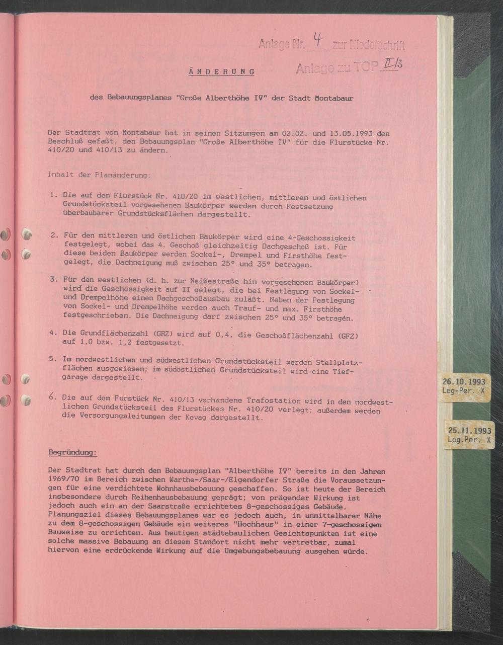 Der Stadtrat von Montabaur hat in seinen Sitzungen am 02.02. und 13.05.1993 den Beschluß gefaßt, den Bebauungsplan "Große Alberthöhe IV" für die Flurstücke Nr. 410/20 und 410/13 zu ändern.