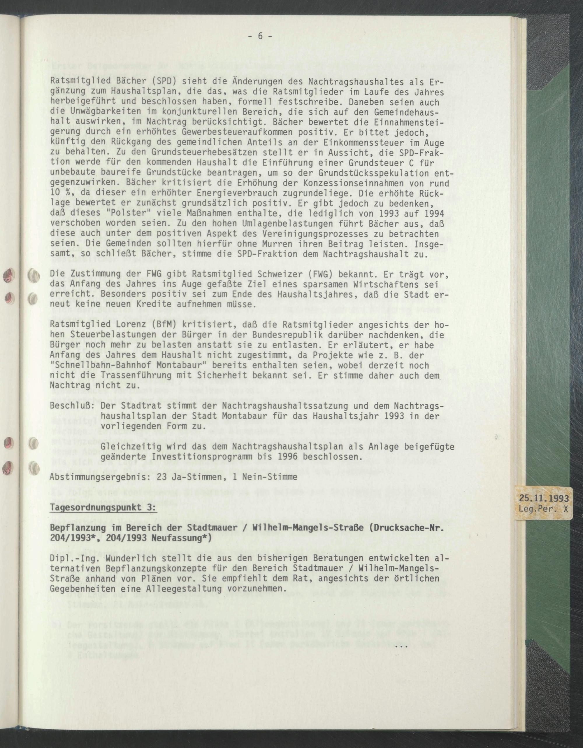 Beschluß: Der Stadtrat stimmt der Nachtragshaushaltssatzung und dem Nachtragshaushaltsplan der Stadt Montabaur für das Haushaltsjahr 1993 in der vorliegenden Form zu.