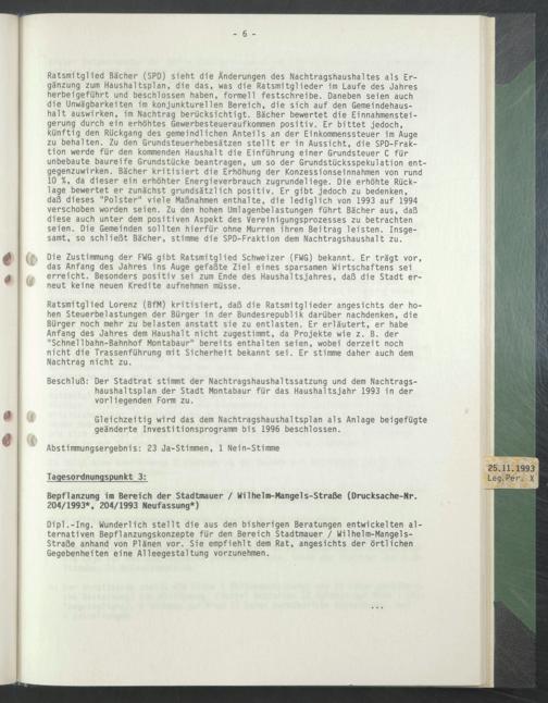 Die Zustimmung der FWG gibt Ratsmitglied Schweizer (FWG) bekannt. Er trägt vor, das Anfang des Jahres ins Auge gefaßte Ziel eines sparsamen Wirtschaftens sei erreicht. Besonders positiv sei zum Ende des Haushaltsjahres, daß die Stadt erneut keine neuen Kredite aufnehmen müsse.