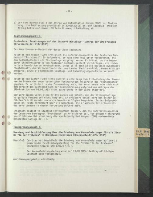 Insgesamt besteht im Stadtrat Einvernehmen darüber, daß die Informationspolitik der Deutschen Bundespost "Postdienst" zu kritisieren sei. Vor diesem Hintergrund beschließt der Rat einstimmig die von Ratsmitglied Hebgen (CDU) vorbereitete Resolution (Anlage-Nr. 1).