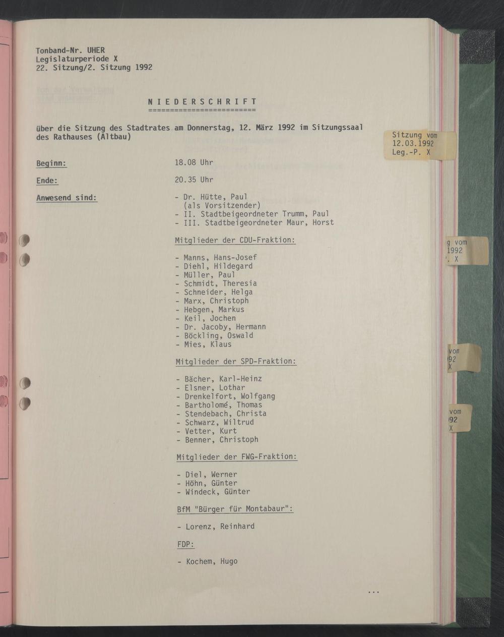 über die Sitzung des Stadtrates am Donnerstag, 12. März 1992 im Sitzungssaal des Rathauses (Altbau)