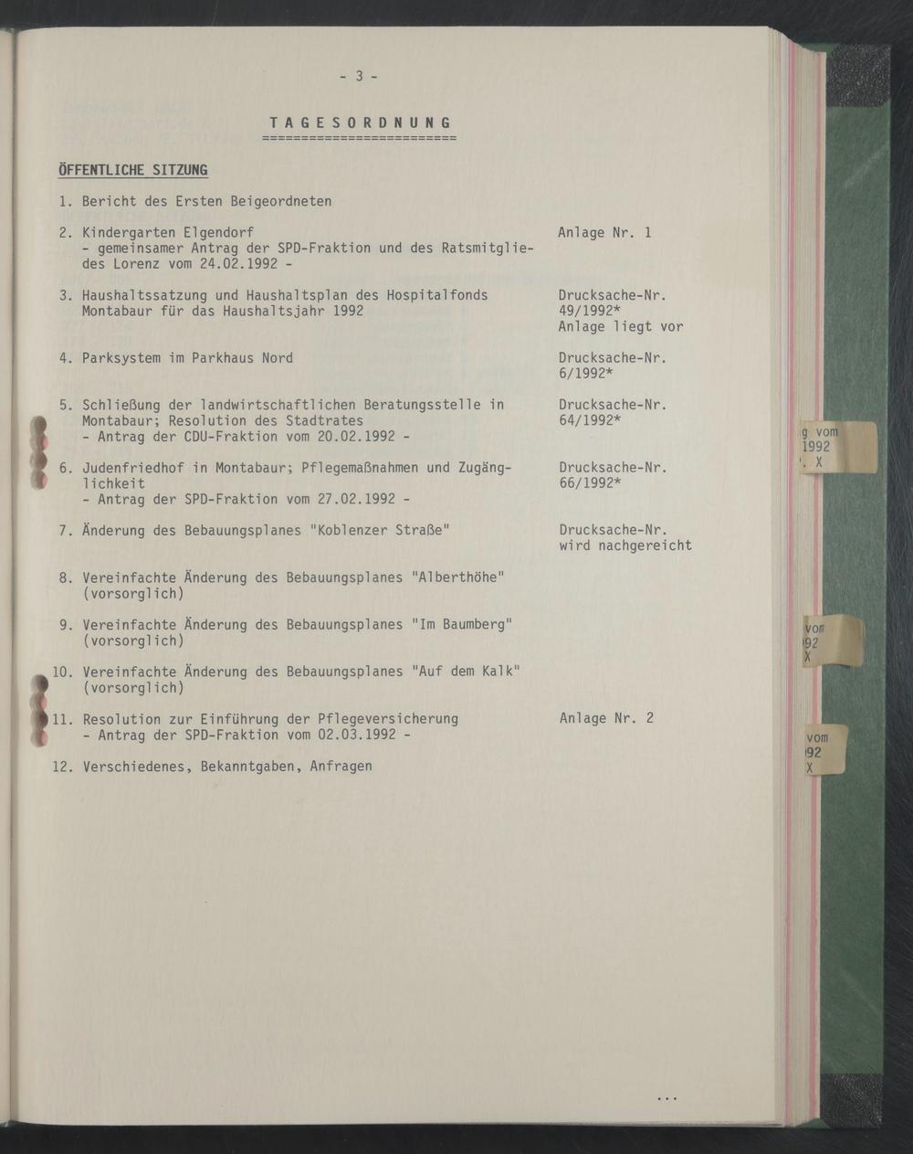 3. Haushaitssatzung und Haushaltsplan des Hospitalfonds Montabaur für das Haushaltsjahr 1992