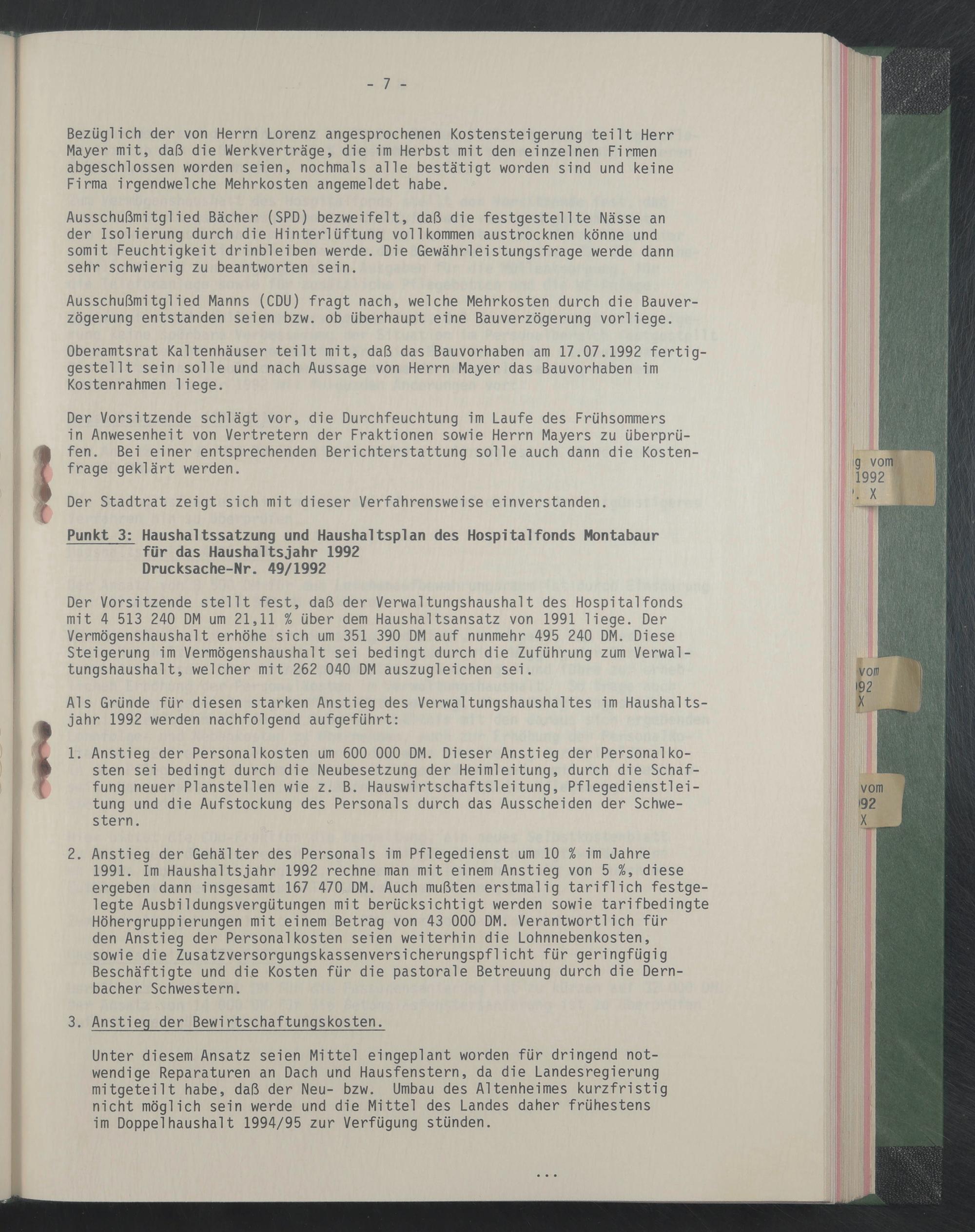 Punkt 3: Haushaltssatzung und Haushaltsplan des Hospitalfonds Montabaur für das Haushaltsjahr 1992 Drucksache-Nr. 49/1992