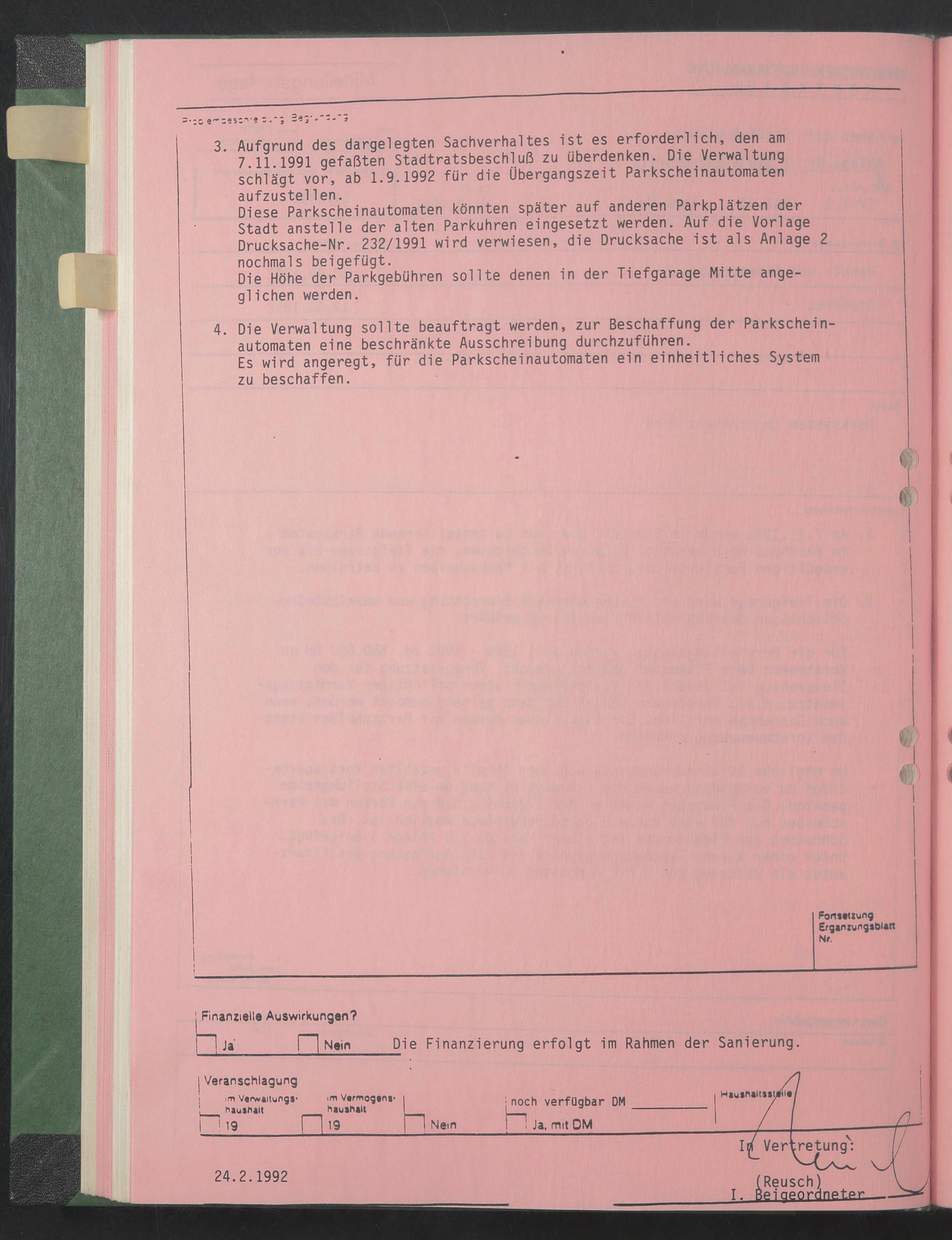3. Aufgrund des dargelegten Sachverhaltes ist es erforderlich, den am 7.11.1991 gefaßten Stadtratsbeschluß zu überdenken. Die Verwaltung schlägt vor, ab 1.9.1992 für die Übergangszeit Parkscheinautomaten aufzustellen.