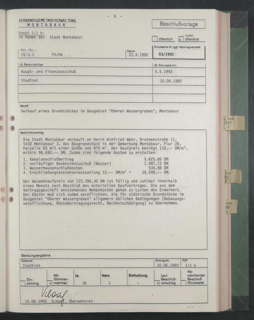 Die Stadt Montabaur verkauft an Herrn Winfried Wehr, Brunnenstraße 11,