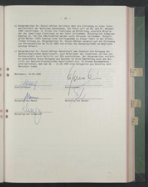 b) Bürgermeister Dr. Possel-Dölken berichtet über die Einladung zu einer Informationsfahrt der Deutschen Bundesbahn. Die Fahrt soll am 06. und 07. Oktober 1992 stattfinden. Er bittet die Fraktionen um Mitteilung, wieviele Mitglieder der jeweiligen Fraktionen an der Fahrt teilnehmen. Ratsmitglied Schweizer kündigt an, für die FWG-Fraktion würden sechs Personen teilnehmen. Ratsmitglied Bacher (SPD) kündigt eine Stellungnahme zu dieser Fahrt in der öffentlichen Sitzung an. Bürgermeister Dr. Possel-Dölken verweist auf die Einladung zur Forstexkursion am 14.10.1992 und bittet die Ratsmitglieder um möglichst baldige Antwort.