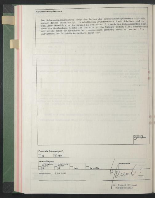 □er Bebauungsplanänderuna liegt der Antrag des Grundstückseigentümers zugrunde, wonach dieser beabsichtigt, im nördlichen Grundstücksteil ein Wohnhaus und im südlichen Bereich eine Arztpraxis zu errichten. Die nach dem Bebauungsplan festgesetzte überbaubare Fläche ist für eine solche Nutzung iedoch nicht ausreichend und sollte daher entsprechend der vorgesehenen Bebauung erweitert werden. Die Zustimmung der Grundstücksnachbarn liegt vor.