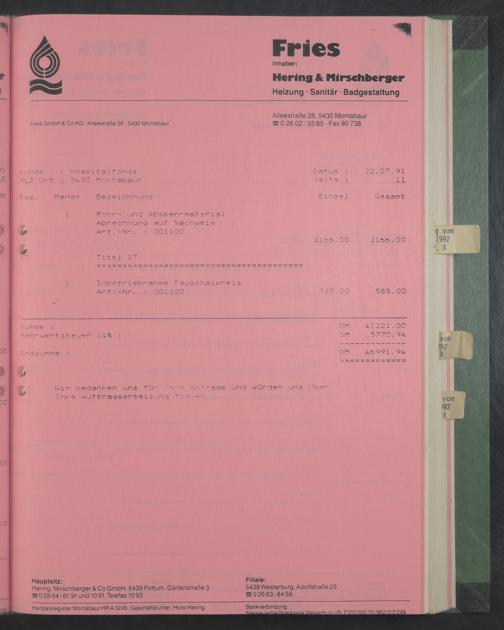 Rohr- und Abscerrmaterial Abrechnung auf Nachweis Art.-Nr. : 001100
