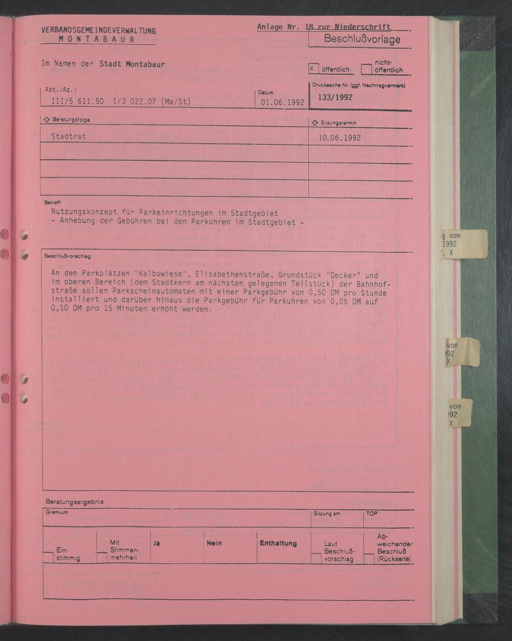 An den Parkplätzen "Kalbswiese", Elisabethenstraße, Grundstück "Decker" und im oberen Bereich (dem Stadtkern am nächsten gelegenen Teil stück) der Bahnhofstraße sollen Parkscheinautomaten mit einer Parkgebühr von 0,50 DM pro Stunde installiert und darüber hinaus die Parkgebühr für Parkuhren von 0,05 DM auf 0,10 DM pro 15 Minuten erhöht werden.