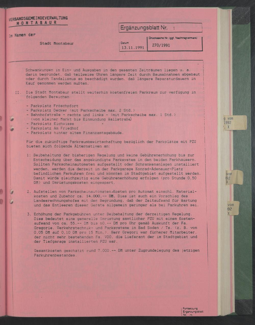 3. Erhöhung der Parkgebühren unter Beibehaltung der derzeitigen Regelung. Dies bedeutet eine generelle Umrüstung sämtlicher PZU mit einem Kostenaufwand von ca. 55,— DM bis 60.— DM pro Uhr gemäß Auskunft der Fa. Gregorie, Verkehrstechnik- und Parksysteme in Bad Soden / Ts. (z. B. von 0,05 DM auf 0,10 DM pro 15 Min.). Herr Gregori war fürherer Mitarbeiter, der nicht mehr bestehenden Fa. VD0, die Lieferant der im Stadtgebiet und der Tiefgarage installierten PZU war.