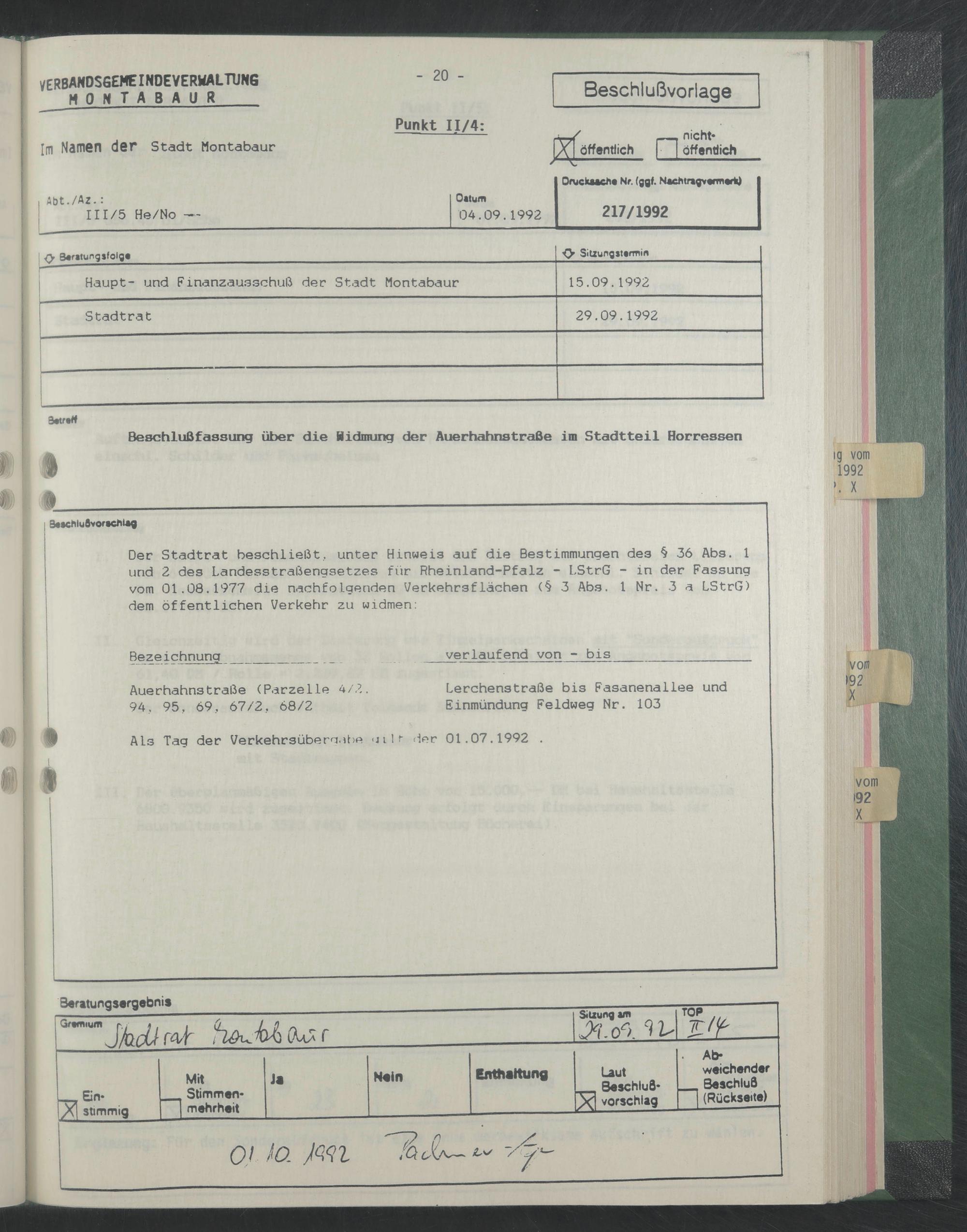 Beschlußfassung über die Widmung der Auerhahnstraße im Stadtteil Horressen