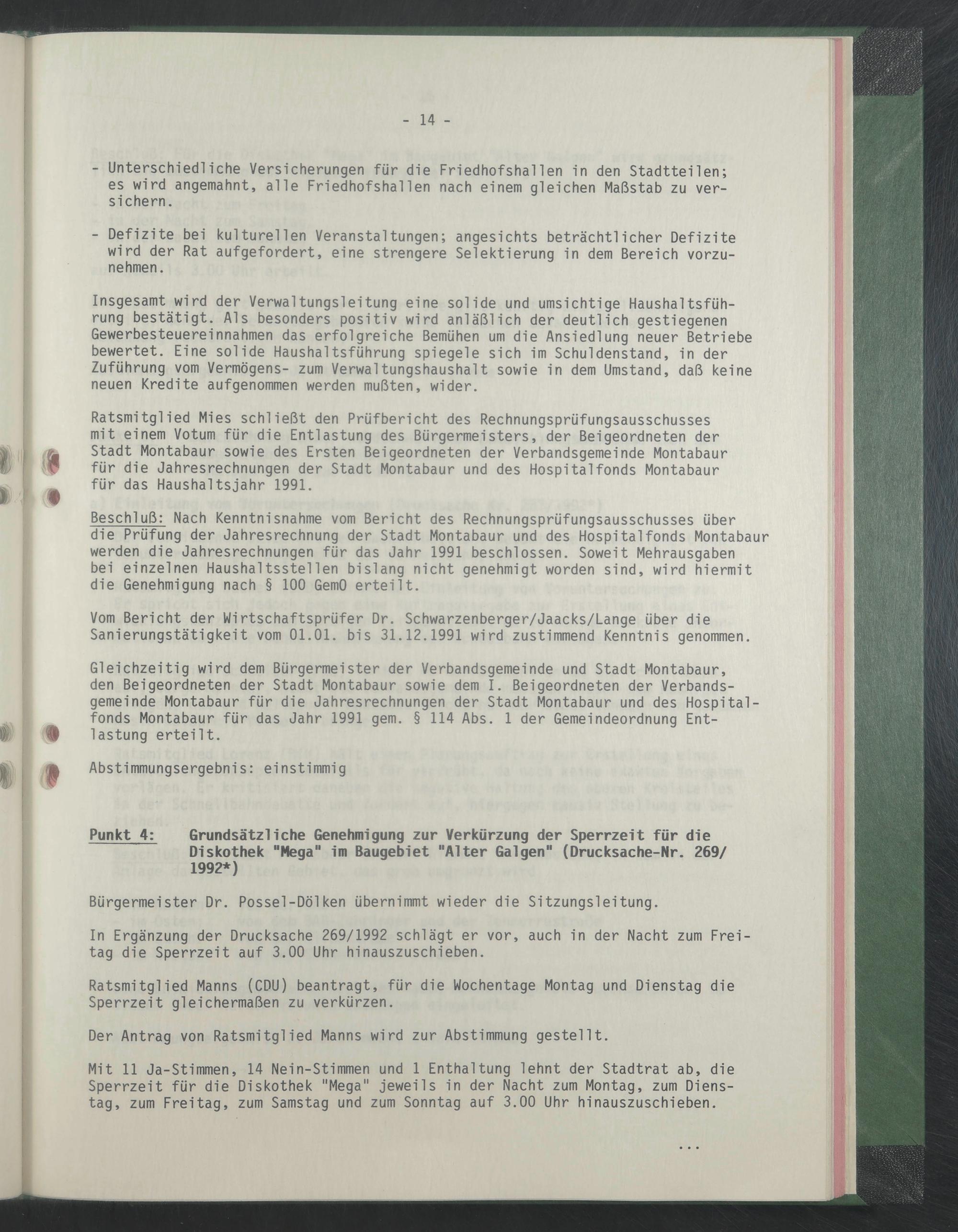 Ratsmitglied Mies schließt den Prüfbericht des Rechnungsprüfungsausschusses mit einem Votum für die Entlastung des Bürgermeisters, der Beigeordneten der Stadt Montabaur sowie des Ersten Beigeordneten der Verbandsgemeinde Montabaur für die Jahresrechnungen der Stadt Montabaur und des Hospitalfonds Montabaur für das Haushaltsjahr 1991.