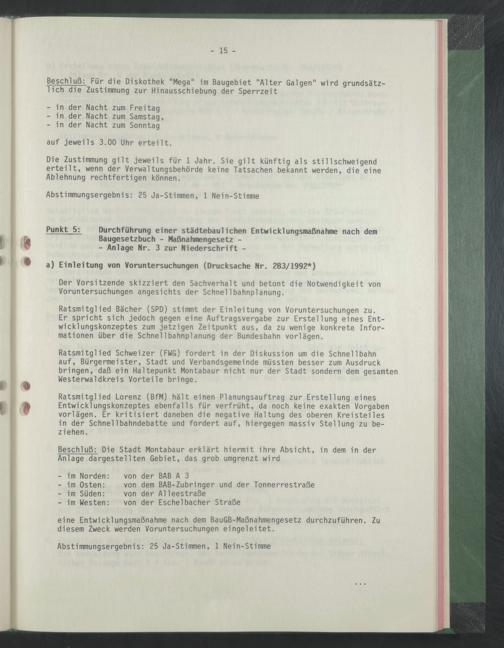 Ratsmitglied Lorenz (BfM) hält einen Planungsauftrag zur Erstellung eines Entwicklungskonzeptes ebenfalls für verfrüht, da noch keine exakten Vorgaben vorlägen. Er kritisiert daneben die negative Haltung des oberen Kreisteiles in der Schnellbahndebatte und fordert auf, hiergegen massiv Stellung zu beziehen.