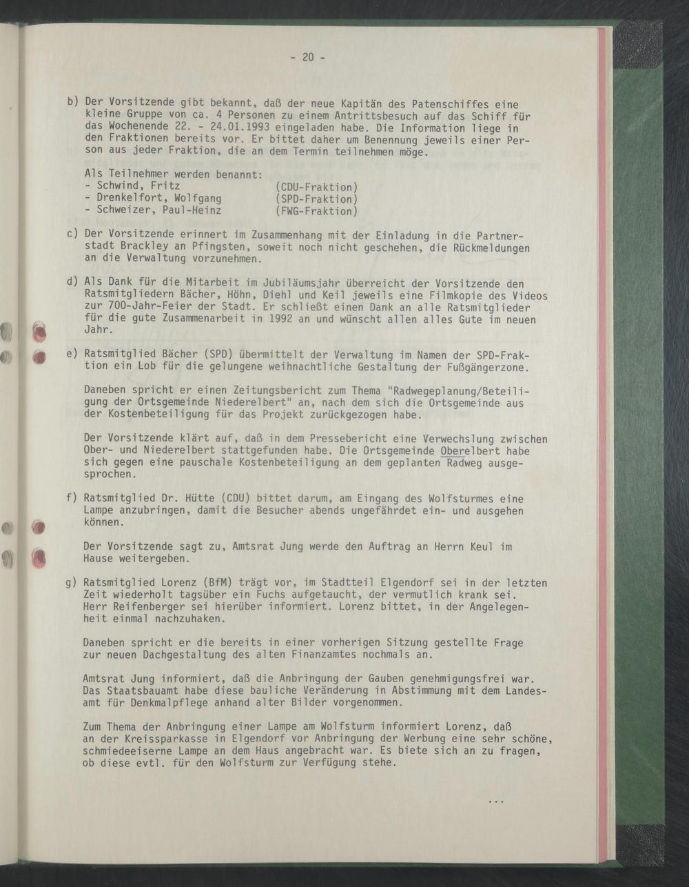b) Der Vorsitzende gibt bekannt, daß der neue Kapitän des Patenschiffes eine kleine Gruppe von ca. 4 Personen zu einem Antrittsbesuch auf das Schiff für das Wochenende 22. - 24.01.1993 eingeladen habe. Die Information liege in den Fraktionen bereits vor. Er bittet daher um Benennung jeweils einer Person aus jeder Fraktion, die an dem Termin teil nehmen möge.