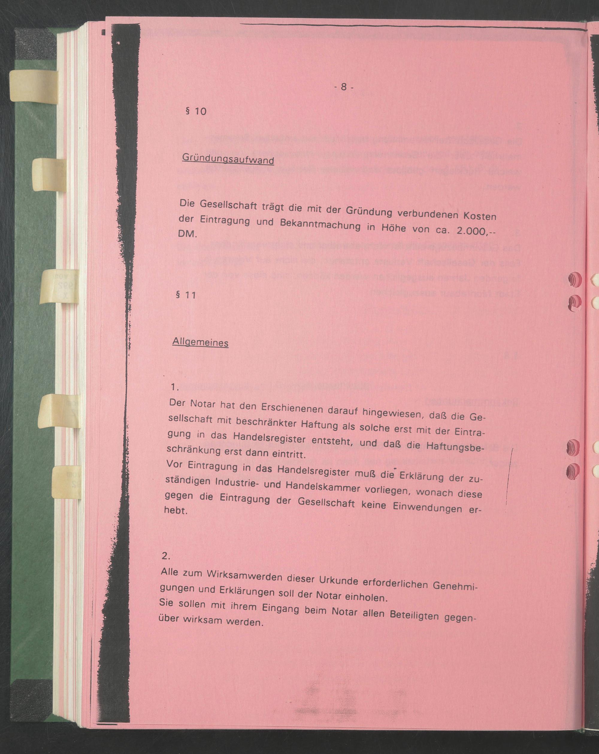 Die Gesellschaft trägt die mit der Gründung verbundenen Kosten der Eintragung und Bekanntmachung in Höhe von ca. 2.000,-- DM.