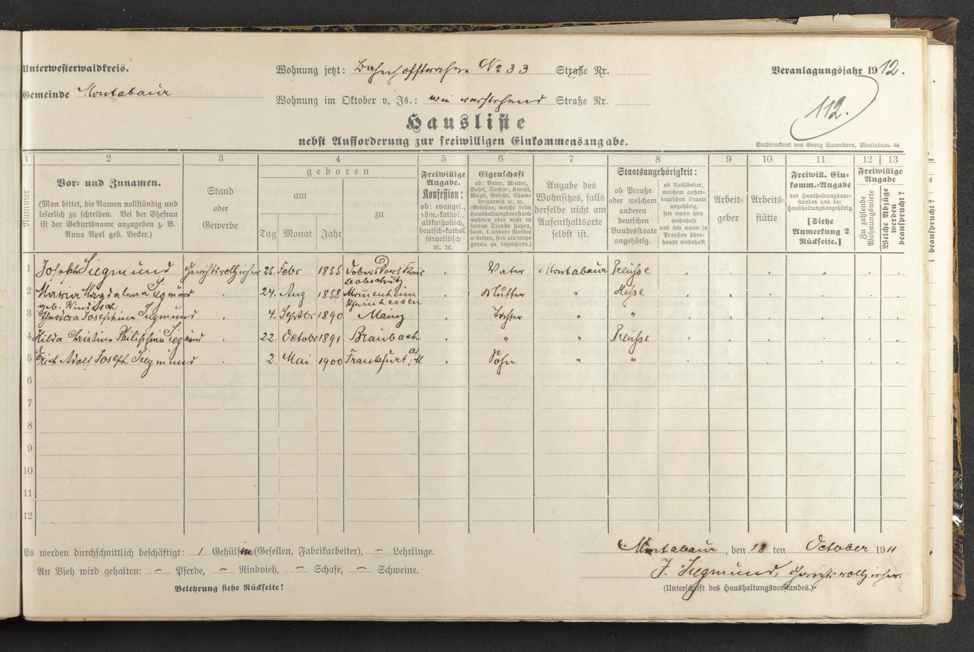Siegmund, Joseph Siegmund, Maria Magdalena geb. Windisch Siegmund, Theodora Siegmund, Hilda Siegmund, Erich Adolf Josef