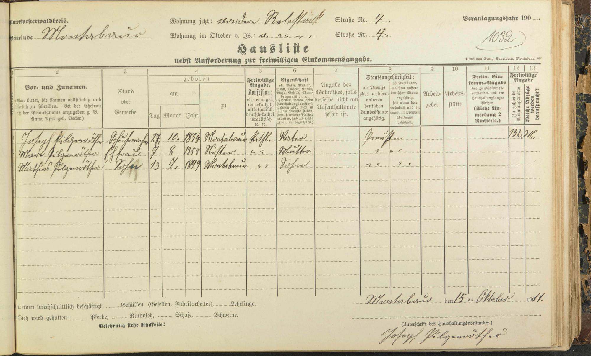 Haushaltsliste 1911/12, Sauertalstraße bis Werbhausgasse sowie Mühlen