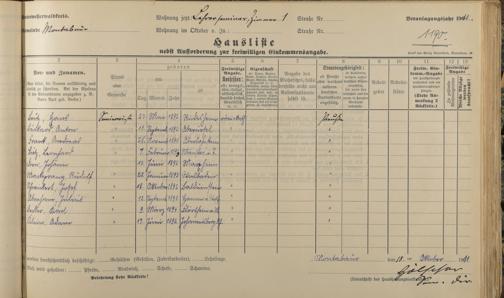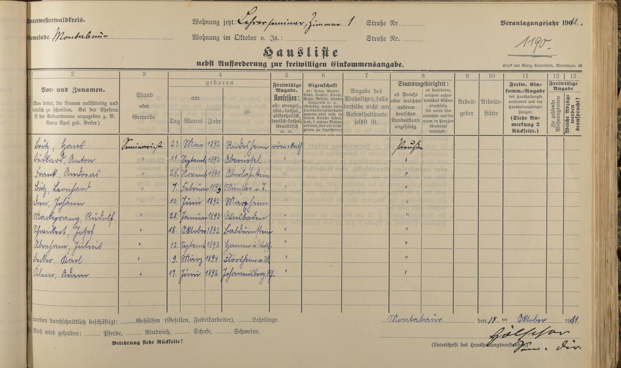 Lehrerseminar, Zimmer 1 Brötz, Hans Burkard, Anton Frank, Andreas Bätz, Bernhard Dorn, Johann Mackegranz [?], Rudolf Schwickert, Joseph Abraham, Julius Becker, Karl Klein, Adam