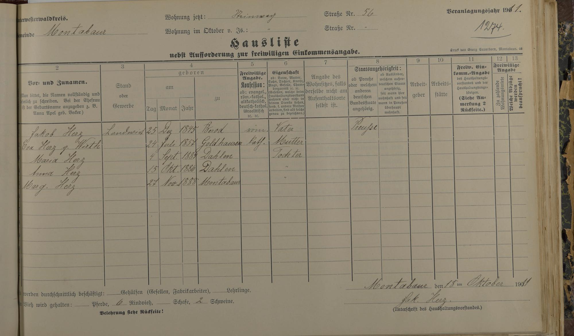 Herz, Jakob Herz, Eva geb. Wirth Hannappel, Maria geb. Herz Hasdenteufel, Anna geb. Herz Herz, Margaretha