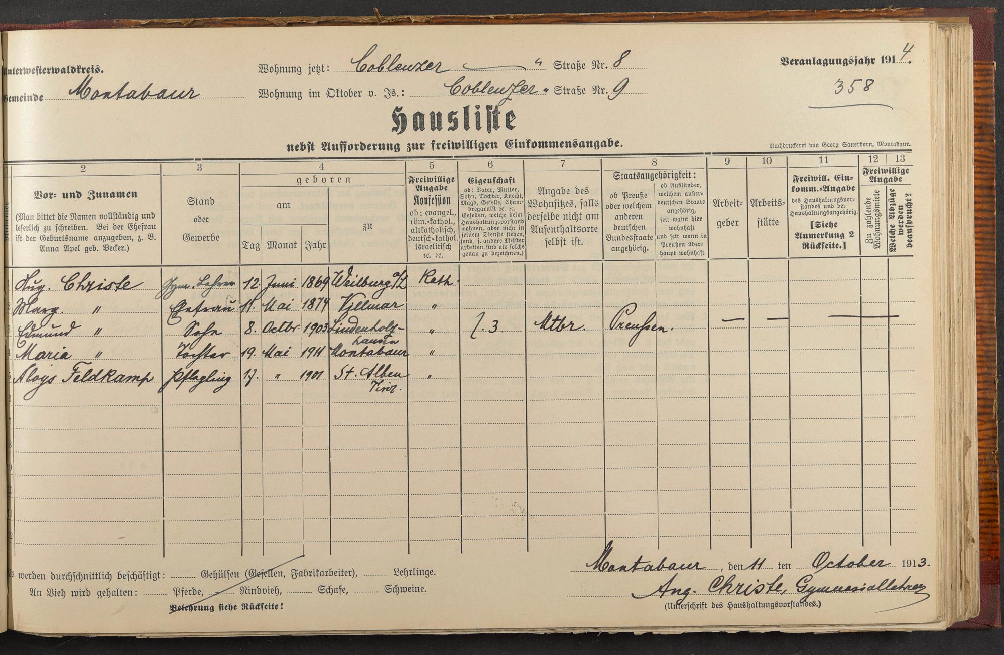 Haushaltsliste 1913/14, Coblenzer Straße bis Judengasse