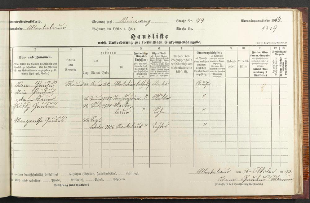 Haushaltsliste 1913/14, Sauertalstraße bis Werbhausgasse sowie Mühlen